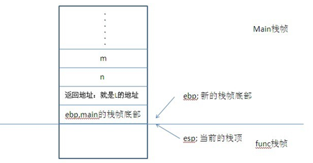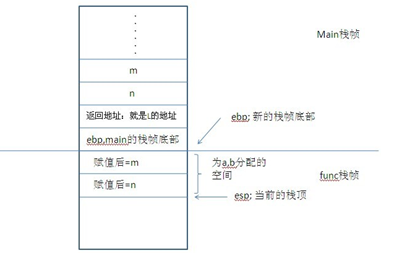 从低地址esp到高地址ebp的这块区域,就是当前main函数的栈帧。当main中调用func时,写成汇编大致是:
