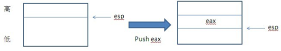 入栈操作:push eax; 等价于 esp=esp-4,eax->[esp];如下图
