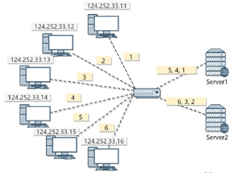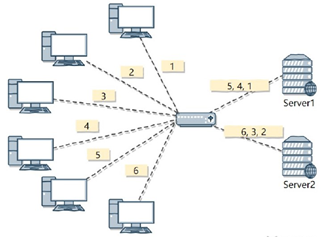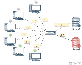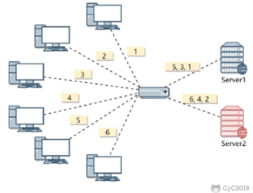 下图中,一共有6个客户端产生了6个请求,这6个请求按(1,2,3,4,5,6)的顺序发送。(1,3,5)的请求会被发送到服务器1,(2,4,6)的请求会被发送到服务器2.