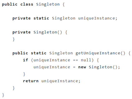 以下实现中,私有静态变量 uniqueInstance 被延迟实例化,这样做的好处是,如果没有用到该类,那么就不会实例化 uniqueInstance,从而节约资源。