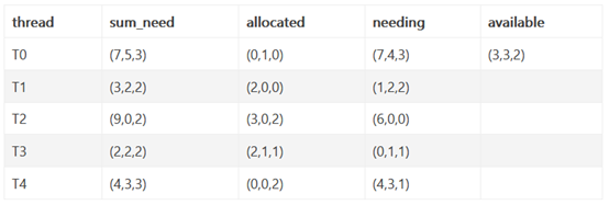 系统中有R1,R2,R3三种资源,在time0时刻,5个线程T0,T1,T2,T3,T4对资源占用和需求的情况如下表,此时系统的可用资源向量为(3,3,2)。求T0时刻系统是否存在安全序列?