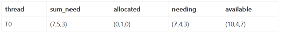 2、进入time1时刻,available(5,3,2) > T3.needing(0,1,1);所以T3可以执行,T3执行完毕之后available = T3.allocated(2,1,1)+available(5,3,2) = (7,4,3);