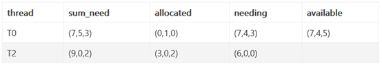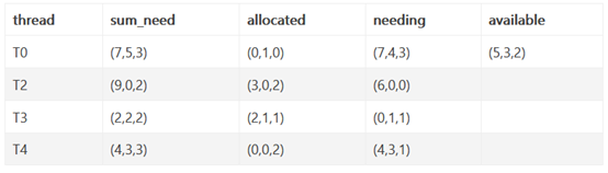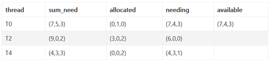3、进入time2时刻,available(7,4,3) > T4.needing(4,3,1);所以T4可以执行,T4执行完毕之后available = T4.allocated(0,0,2) + available(7,4,3) = (7,4,5);