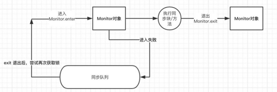 具体实现是在编译之后在同步方法调用前加入一个monitor.enter指令,在退出方法和异常处插入monitor.exit的指令。其本质就是对一个对象监视器(Monitor)进行获取,而这个获取过程具有排他性从而达到了同一时刻只能一个线程访问的目的。而对于没有获取到锁的线程将会阻塞到方法入口处,直到获取锁的线程monitor.exit之后才能尝试继续获取锁。