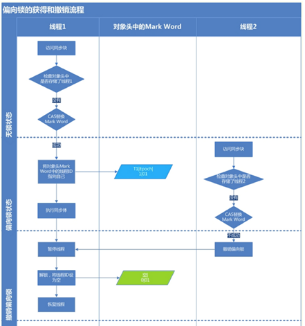 线程1检查对象头中的Mark Word中是否存储了线程1,如果没有则CAS操作将Mark Word中的线程ID替换为线程1。此时,锁偏向线程1,后面该线程进入同步块时不需要进行CAS操作,只需要简单的测试一下Mark Word中是否存储指向当前线程的偏向锁,如果成功表明该线程已经获得锁。如果失败,则再需要测试一下Mark Word中偏向锁标识是否设置为1(是否是偏向锁),如果没有设置,则使用CAS竞争锁,如果设置了,则尝试使用CAS将偏向锁指向当前线程