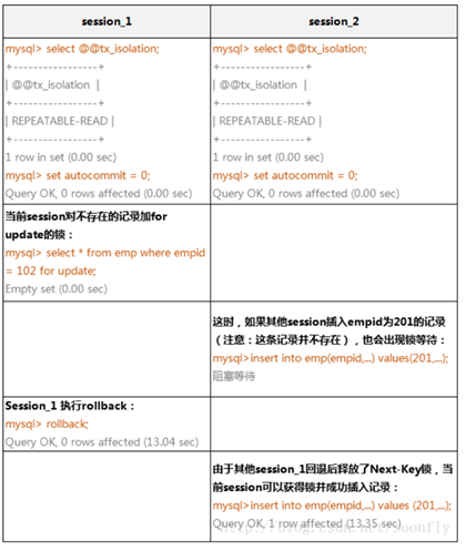 还要特别说明的是,InnoDB除了通过范围条件加锁时使用间隙锁外,如果使用相等条件请求给一个不存在的记录加锁,InnoDB也会使用间隙锁!下面这个例子假设emp表中只有101条记录,其empid的值分别是1,2,……,100,101。