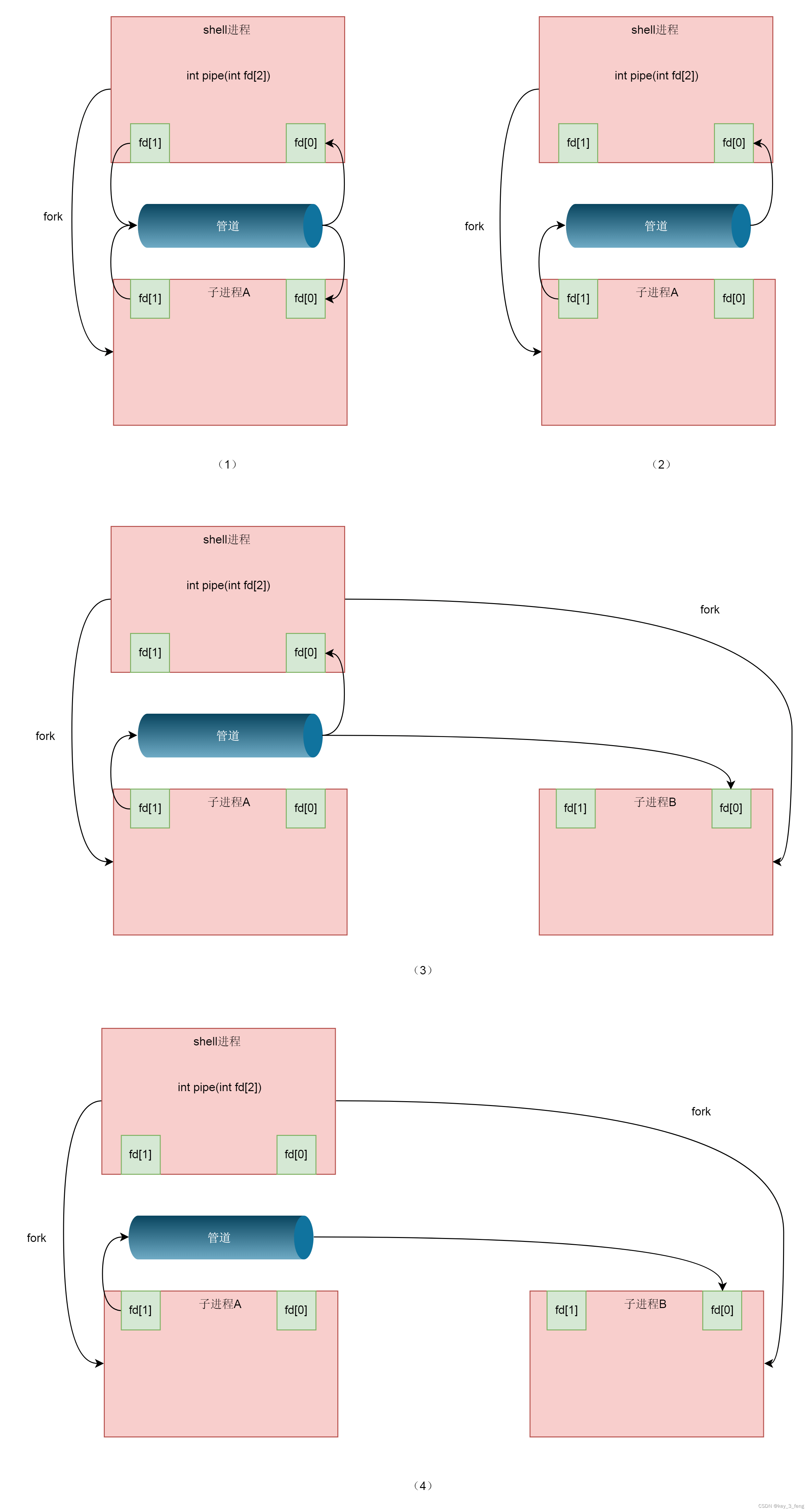 我们首先从 shell 创建子进程 A,然后在 shell 和 A 之间建立一个管道,其中 shell 保留读取端,A 进程保留写入端,然后 shell 再创建子进程 B。这又是一次 fork,所以,shell 里面保留的读取端的 fd 也被复制到了子进程 B 里面。这个时候,相当于 shell 和 B 都保留读取端,只要 shell 主动关闭读取端,就变成了一管道,写入端在 A 进程,读取端在 B 进程。