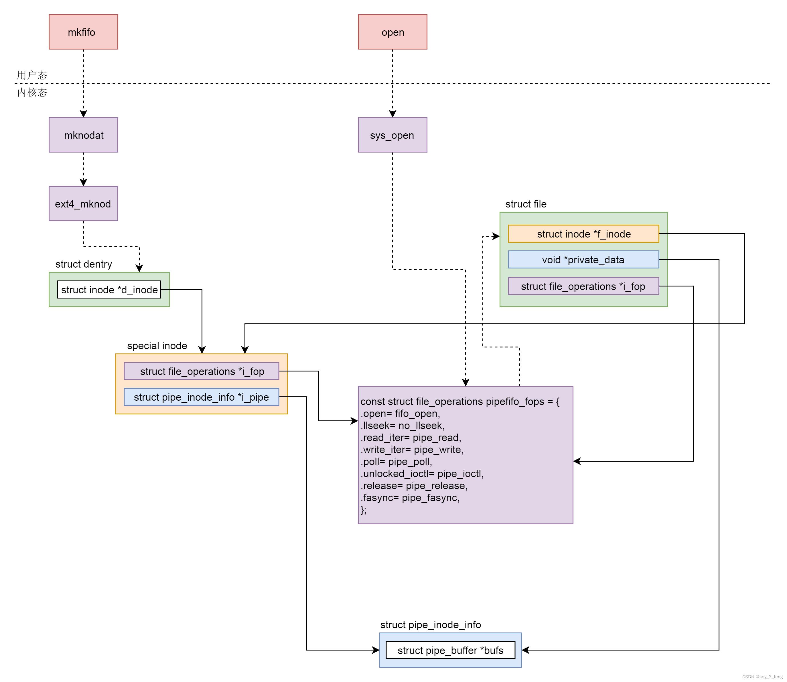 在这种特殊的 inode 里面,file_operations 指向管道特殊的 pipefifo_fops,这个 inode 对应内存里面的缓存。