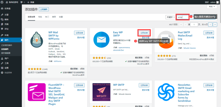 点击插件-安装插件,进入插件搜索页面。我们准备安装Easy WP SMTP。
