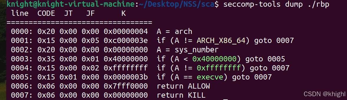 再使用seccomp-tools检查沙箱保护,发现对execve调用进行了过滤,所以考虑进行orw.