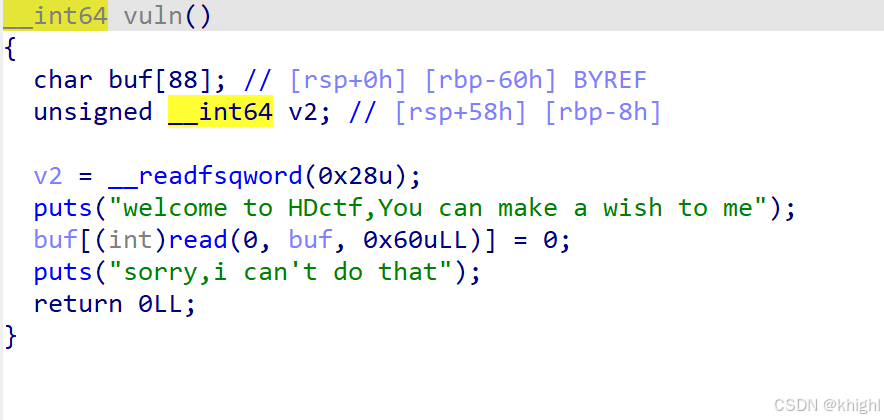 第一个read一看就是泄露canary,canary总以\x00开头,所以根据小端序存储规则,\x00存储在低地址处,如果直接打印会被\x00截断,所以我们可以覆盖一字节,打印后切去第一位,并用\x00补齐