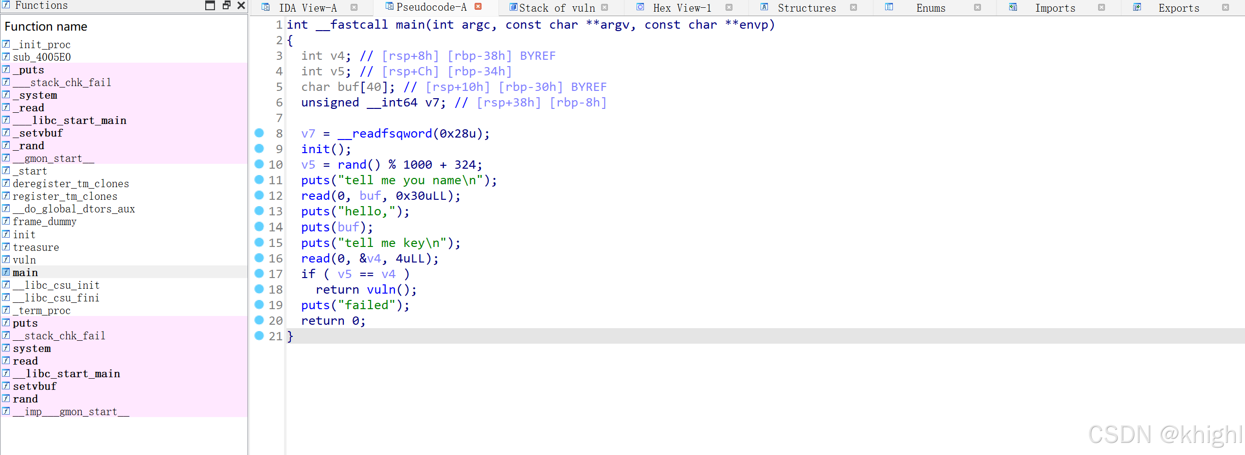 伪随机数的生成,IDA中没有出现srand,time(0)所以这里的v5是个定值,可通过gdb调试,爆破,ctpyes模拟得到v5==707