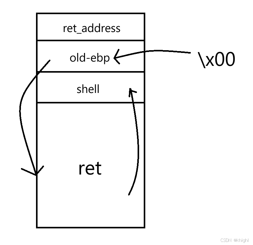 这里只让输入0x60字节,看似无法溢出,但是read的返回值是成功输入的字节数,buf[60]可以修改栈上保存的上个ebp的低字节为\x00,这就够了,因为旧的ebp的上方就是返回地址,当旧ebp被修改时,返回地址就来到了被修改的ebp的高地址处.因为我们只能在栈上输入,所以希望把旧ebp修改到栈上,可是题目存在栈地址随机化,我们不知道修改后的ebp指向栈的哪个位置,甚至不知道是不是在vuln的栈帧中.
