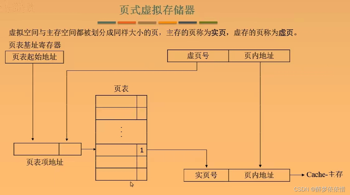 页式虚拟存储器:以页为单位的虚拟存储器称为页式虚拟存储器。虚拟空间和主存空间都被划分为同样大小的页,主存的页称为实页,虚存的页称为虚页。