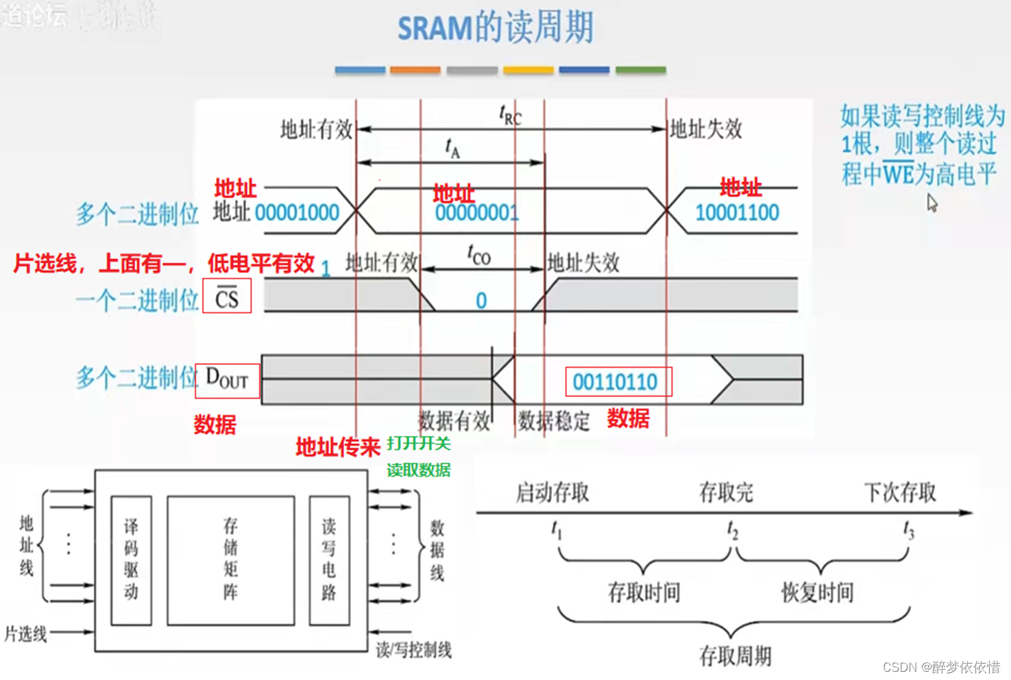 过程分析:地址传过来,地址信号开始有效,过了一会,CS打开开关,开始通过地址来读取数据,有了数据,数据信号开始有效,一会数据稳定后,CS开关关闭,读取数据结束,再过一会,地址信号失效。开始下一次操作。