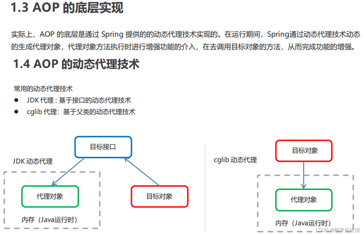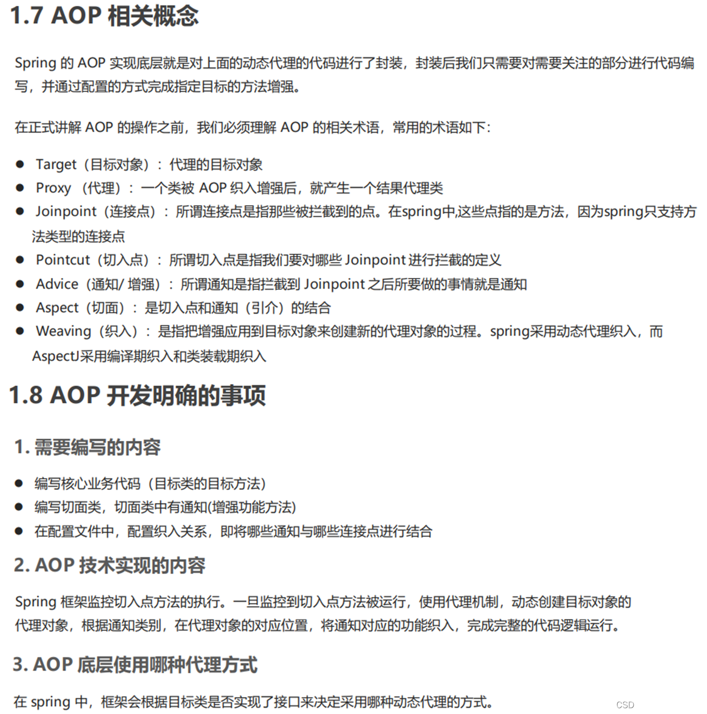本文介绍了Spring的面向切面编程(AOP)概念,包括AOP的JDK和cglib动态代理实现,详细讲解了XML配置AOP的各个部分,如切点表达式的写法、不同类型的通知,以及如何抽取切点表达式。同时,文章还探讨了注解配置AOP的方法,包括注解通知的类型和切点表达式的使用。