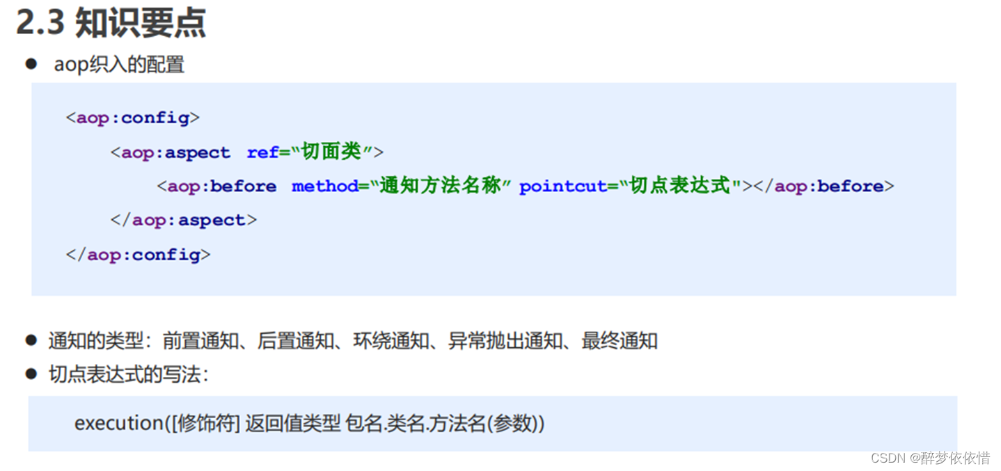 <aop:before method="before" pointcut="execution(public void aop.Target.save())"></aop:before>