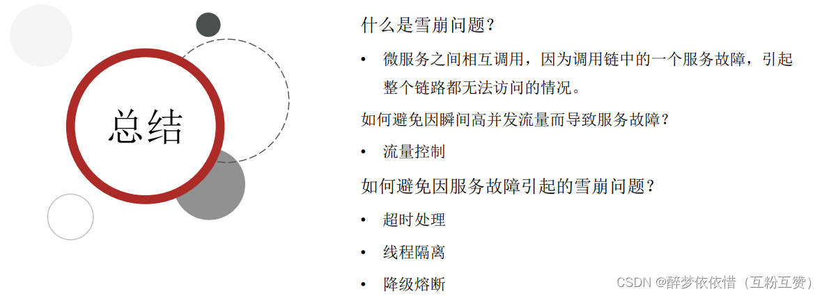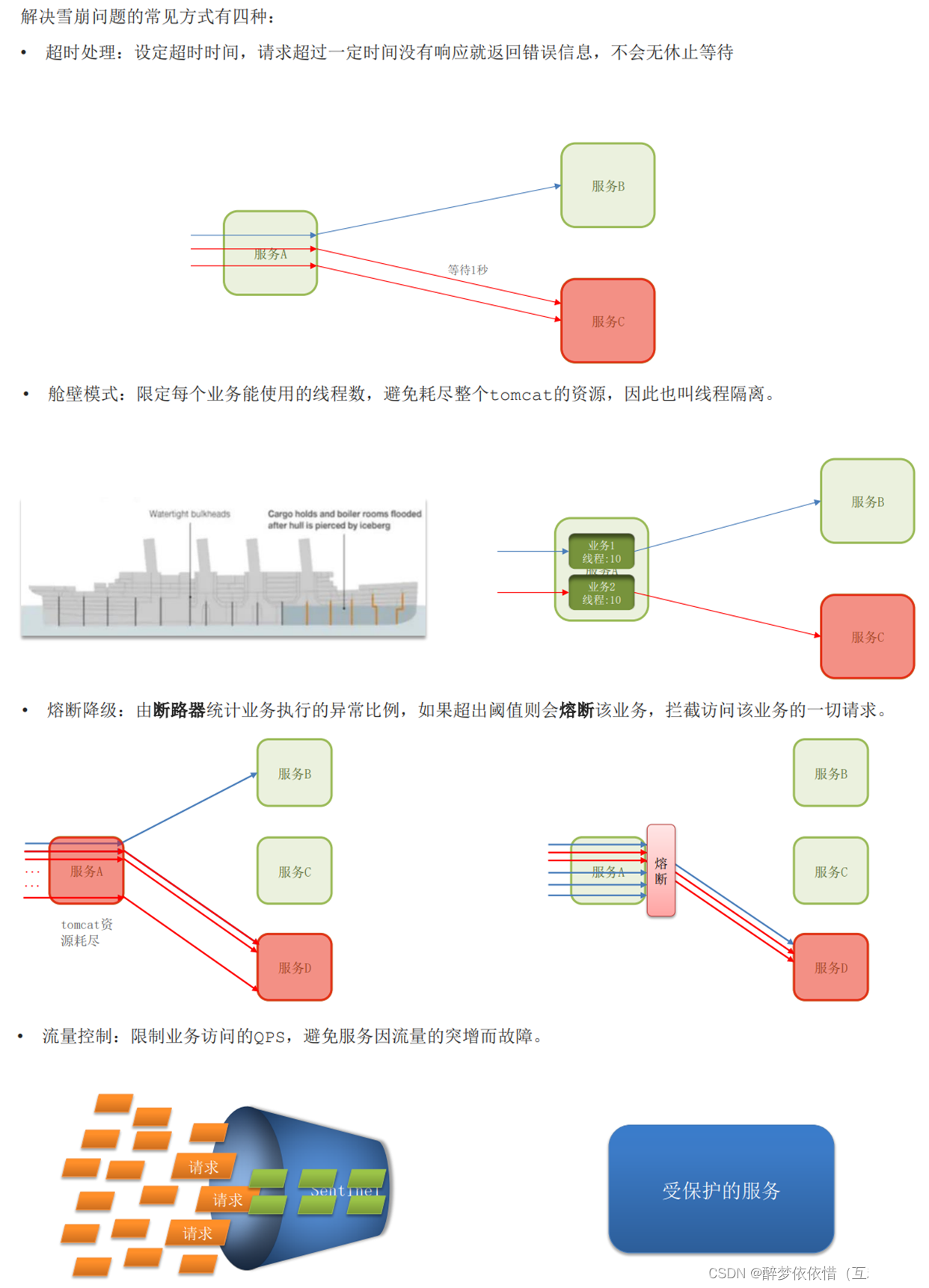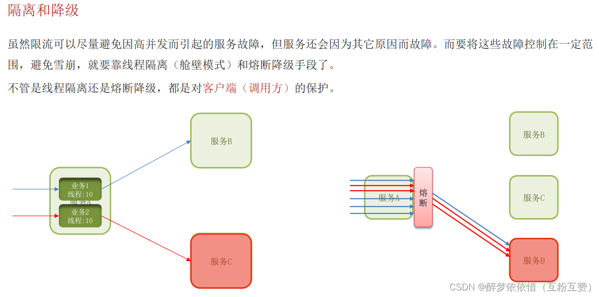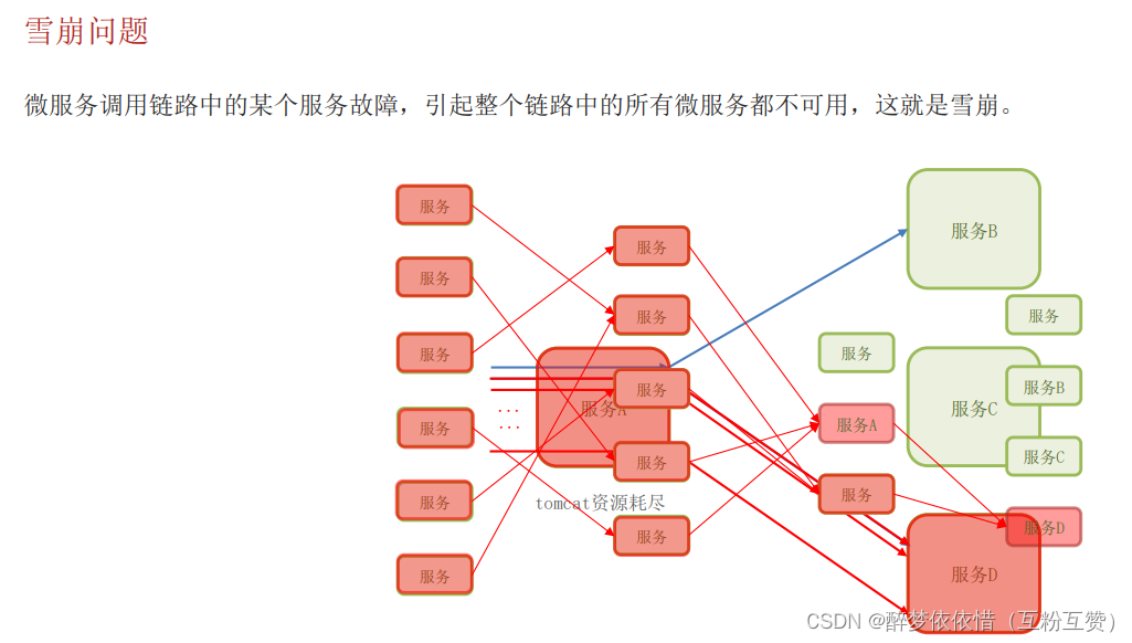 雪崩:一个微服务A依赖(即发送请求,等回应)于另一个微服务B,如果B出现故障,没有回应,则A的这条访问就不会结束(请求不释放),等到微服务A的请求资源都用完后,A也废了(所有访问资源都被占用了)。然后一些微服务依赖服务A的,也得不到A的回应,也跟着废了。这就是雪崩,因为一个微服务出现故障,导致凡是依赖于它的微服务也出现故障。