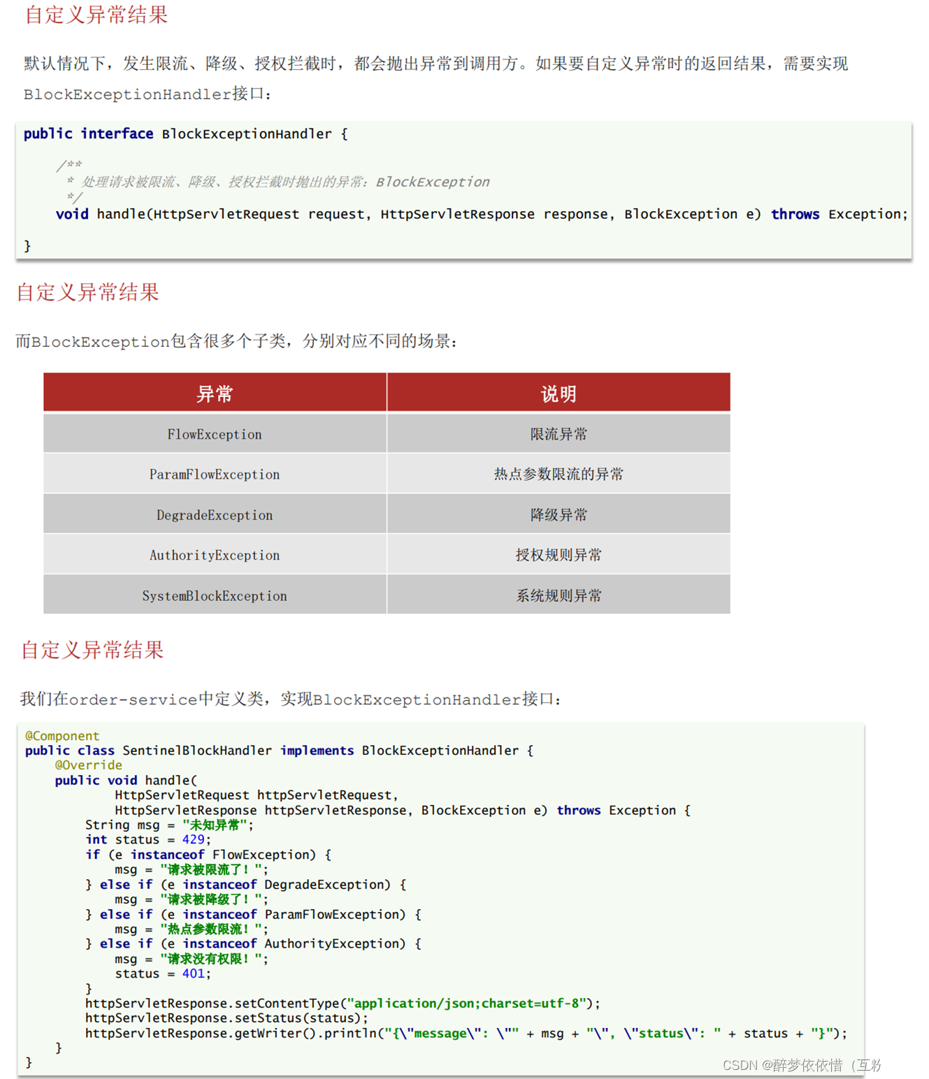 BlockExceptionHandler接口:BlockExceptionHandler接口通常用于处理限流和熔断的异常情况。BlockExceptionHandler接口允许自定义异常处理逻辑,在请求被限流或触发熔断时,可以定义如何处理这些异常情况。(只要不是远程调用,请求被sentinel限流授权等操作,就会调用该实现)