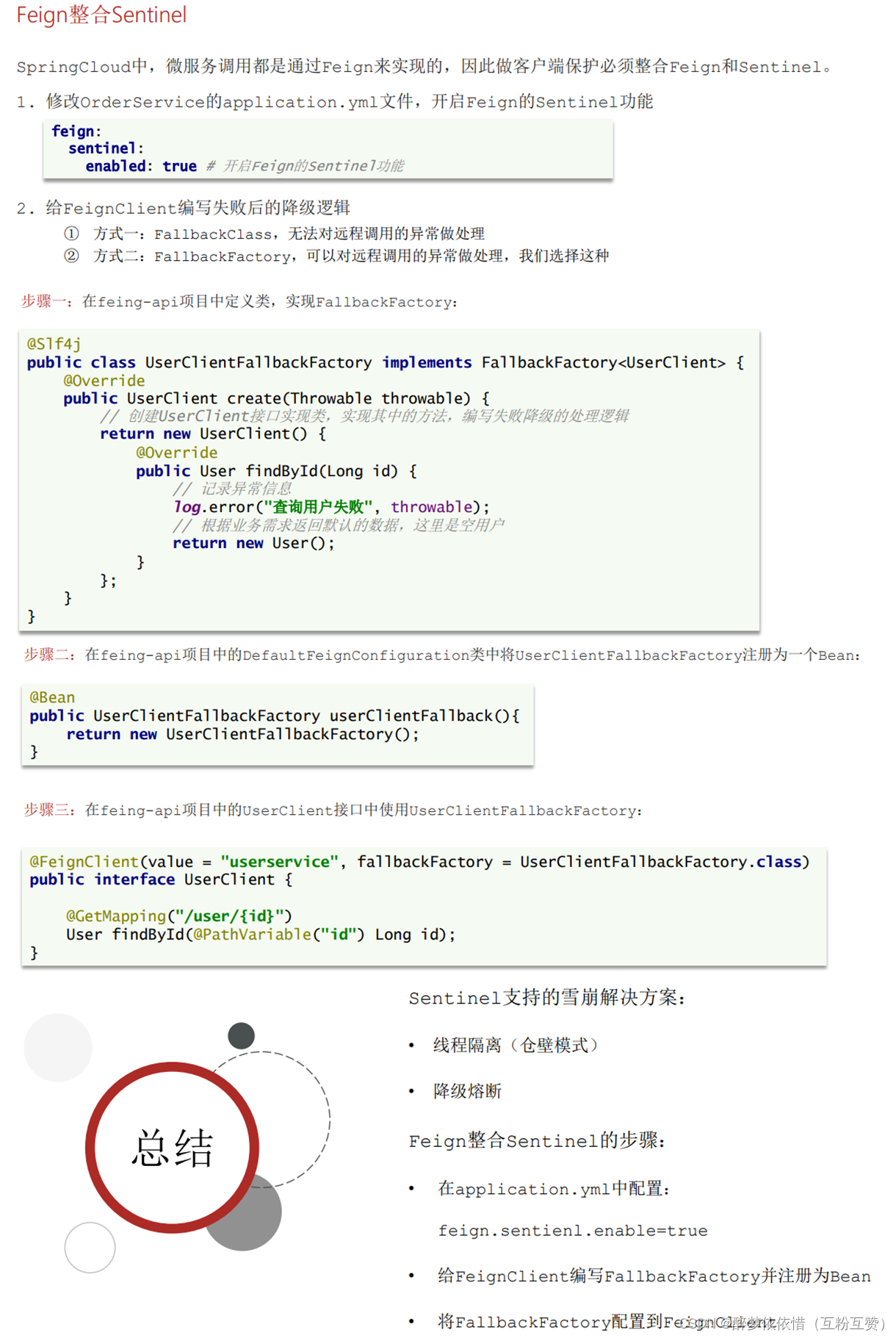 FallbackFactory接口:FallbackFactory接口通常用于实现服务降级的逻辑。当原始服务不可用时,fallback对象会代替原始服务进行处理,并返回预先定义的默认响应或错误信息。(用于远程调用feign,当feign出现异常或熔断隔离,就会调用这个接口的实现)