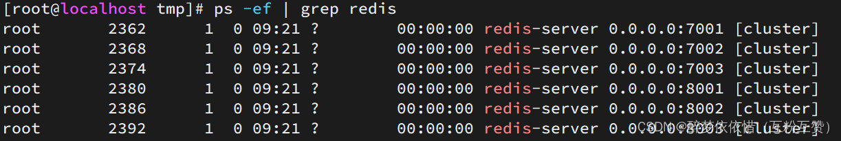 # 进入/tmp目录 cd /tmp # 一键启动所有服务 printf '%s\n' 7001 7002 7003 8001 8002 8003 | xargs -I{} -t redis-server {}/redis.conf通过ps查看状态: