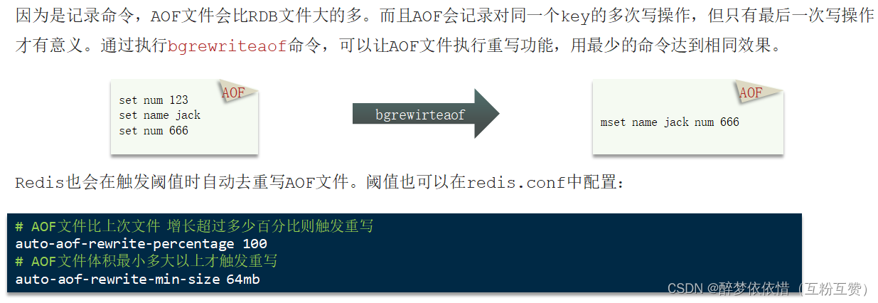 如果还未触发对key的重写,则AOF文件中或许有多个同key的命令(通过执行bgrewriteaof命令,可以让AOF文件执行重写功能)。