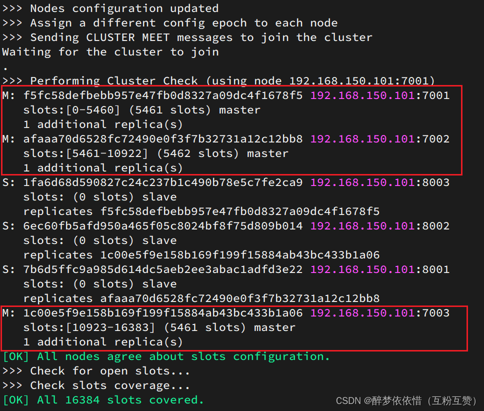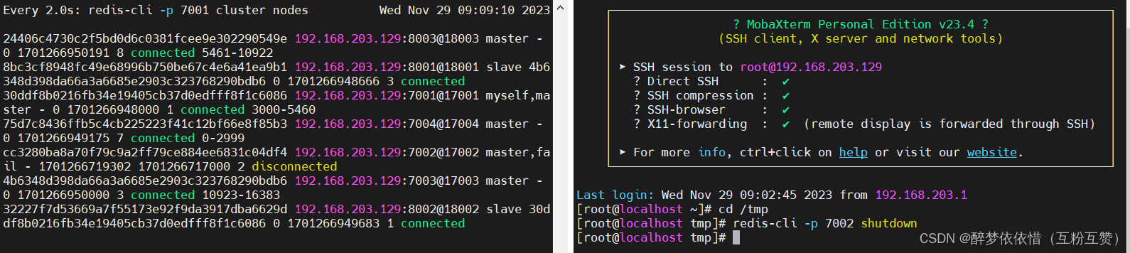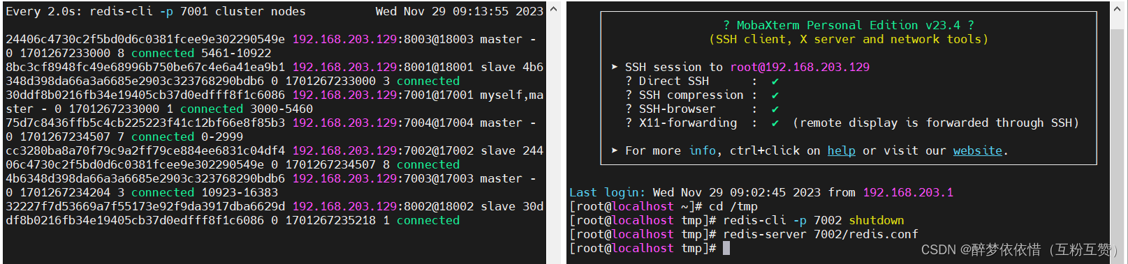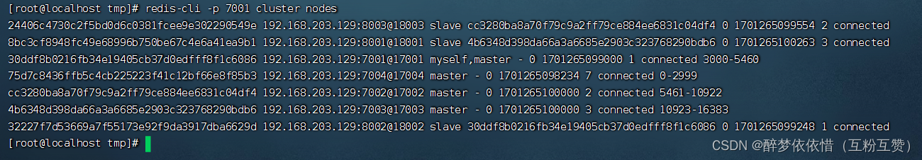 redis-cli -p 7001 cluster nodes命令的含义是通过 Redis 客户端命令行工具连接到端口号为 7001 的 Redis 服务器,并发送cluster nodes命令以获取该 Redis 集群中所有节点的详细信息。4.5.测试