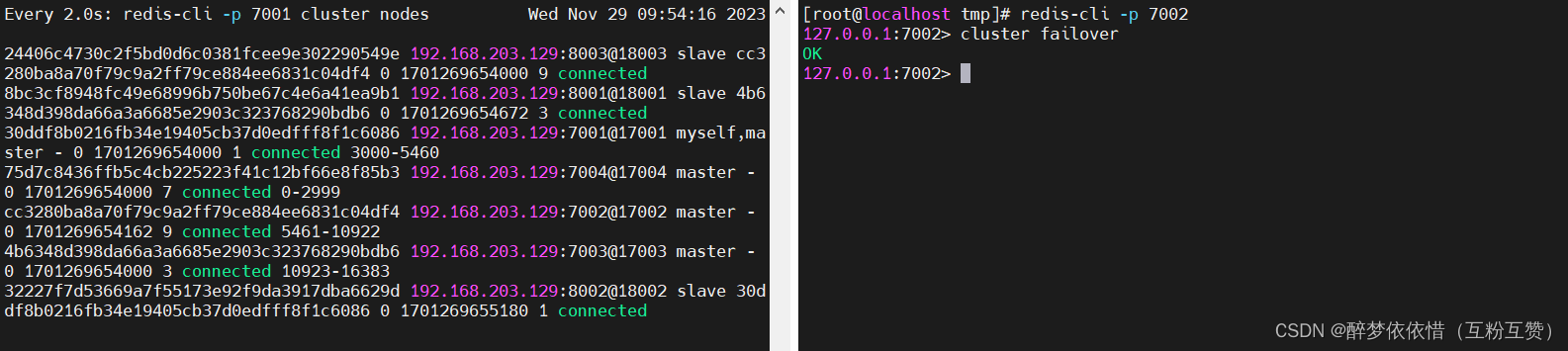 watch redis-cli -p 7001 cluster nodes #动态查看集群状态