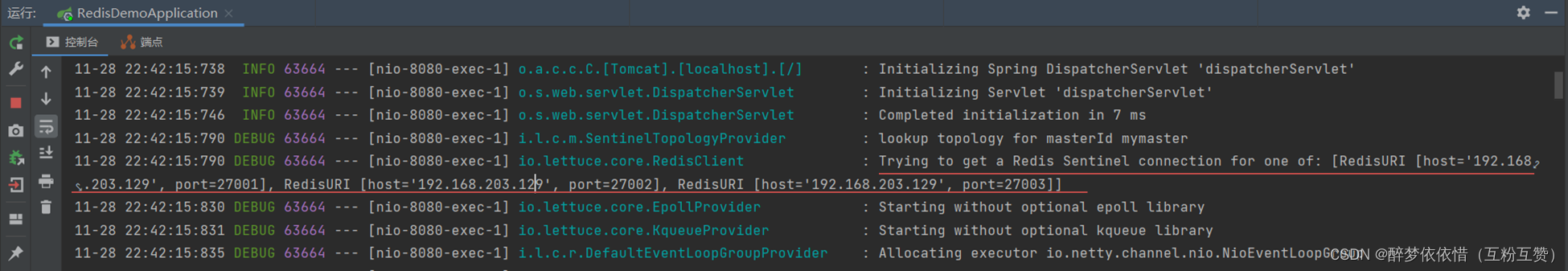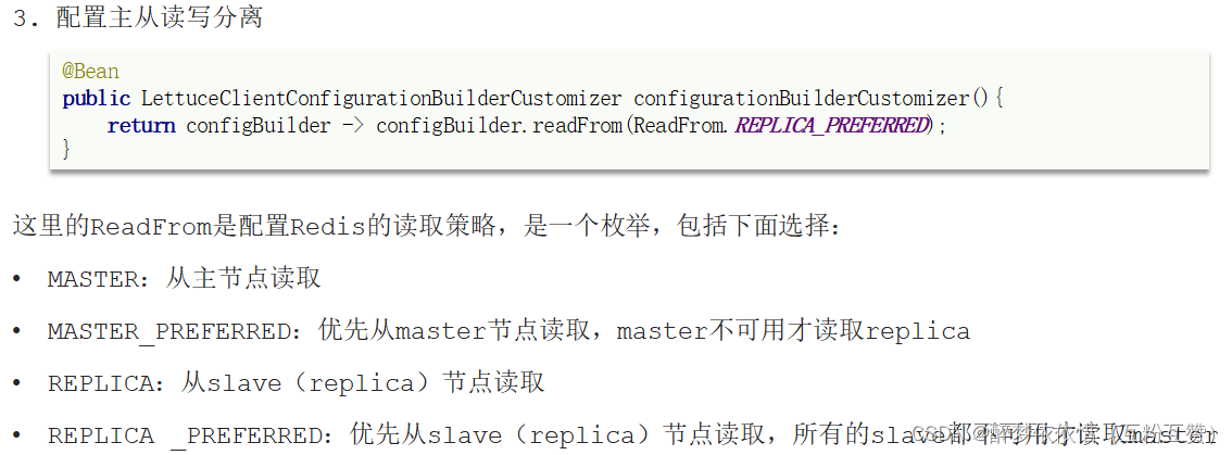 读写分离配置:@SpringBootApplication public class RedisDemoApplication { @Bean public LettuceClientConfigurationBuilderCustomizer clientConfigurationBuilderCustomizer(){ return clientConfigurationBuilder -> clientConfigurationBuilder.readFrom(ReadFrom.REPLICA_PREFERRED); } public static void main(String[] args) { SpringApplication.run(RedisDemoApplication.class, args); } }![]()