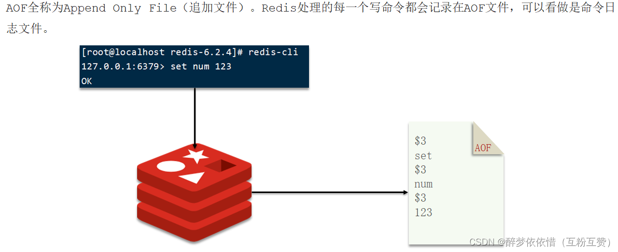 AOF是记录命令,等下次恢复的时候执行AOF文件的命令就能恢复回来。只记录修改的,查看的不加(如get name等命令不会记录)。