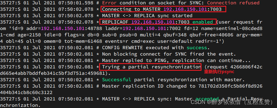 # 连接 7002 redis-cli -p 7002 # 执行slaveof slaveof 192.168.150.101 7001通过redis-cli命令连接7003,执行下面命令:(IP地址是按自己主机改)