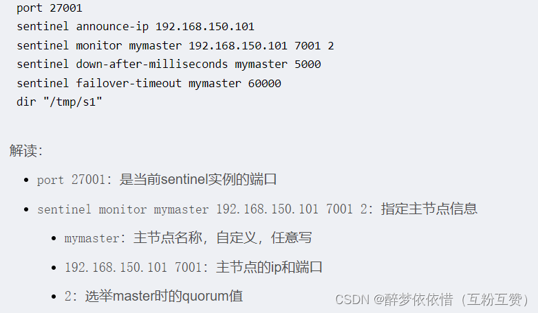 port 27001 sentinel announce-ip 192.168.150.101 sentinel monitor mymaster 192.168.150.101 7001 2 sentinel down-after-milliseconds mymaster 5000 sentinel failover-timeout mymaster 60000 dir "/tmp/s1"解读: