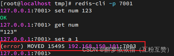 # 连接 redis-cli -p 7001 # 存储数据 set num 123 # 读取数据 get num # 再次存储 set a 1结果悲剧了: