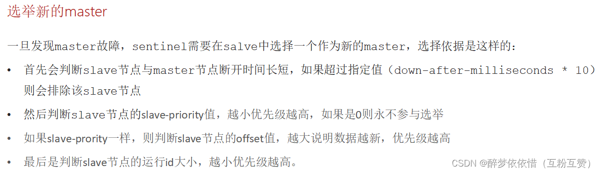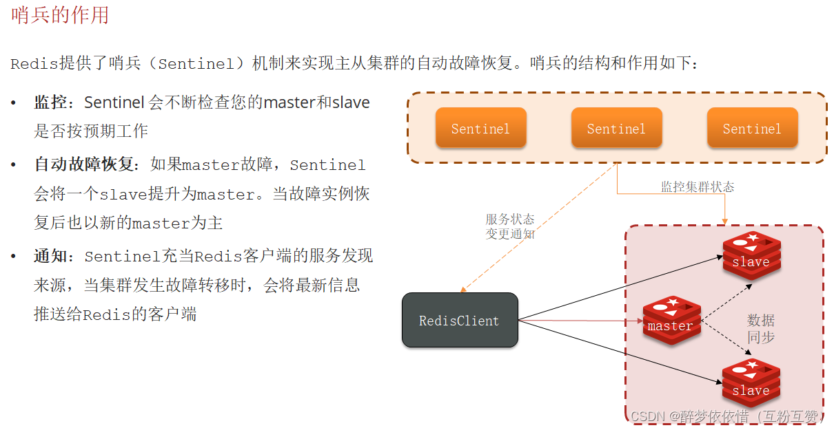 • slave 节点宕机恢复后可以找 master 节点同步数据,那 master 节点宕机怎么办?因为其他slave节点一直跟master同步,master宕机后只需要选一个slave当master即可,宕机节点恢复后变成slave节点。这个过程哨兵机制来操作。