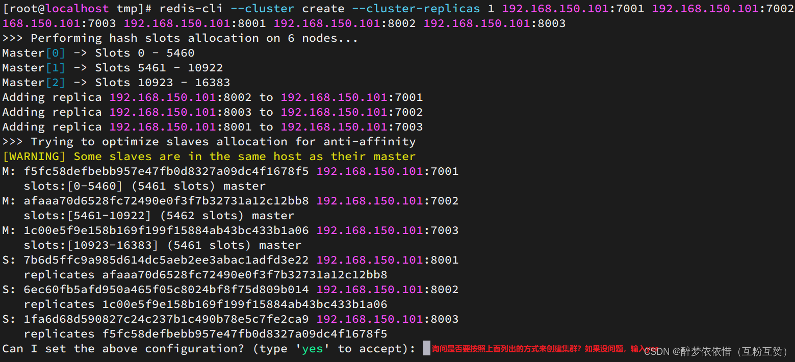 IP PORT 角色 192.168.150.101 7001 master 192.168.150.101 7002 master 192.168.150.101 7003 master 192.168.150.101 8001 slave 192.168.150.101 8002 slave 192.168.150.101 8003 slave 4.2.准备实例和配置