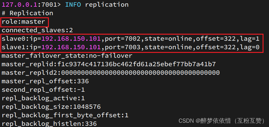 # 连接 7001 redis-cli -p 7001 # 查看状态 info replication结果: