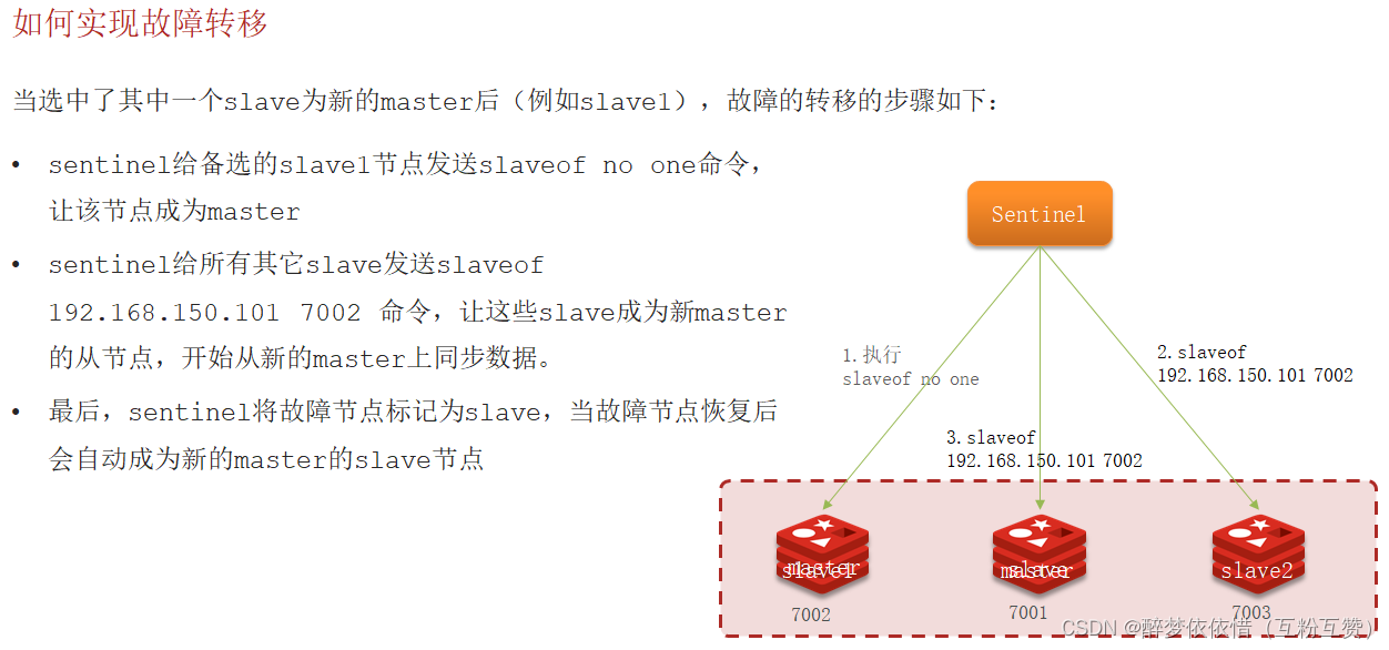 • 首先选定一个 slave 作为新的 master ,执行 slaveof no one• 然后让所有节点都执行 slaveof 新 master• 修改故障节点配置,添加 slaveof 新 master