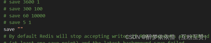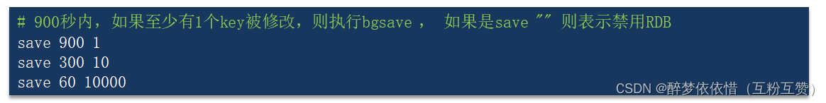Redis内部有触发RDB的机制,可以在redis.conf文件中找到,格式如下: