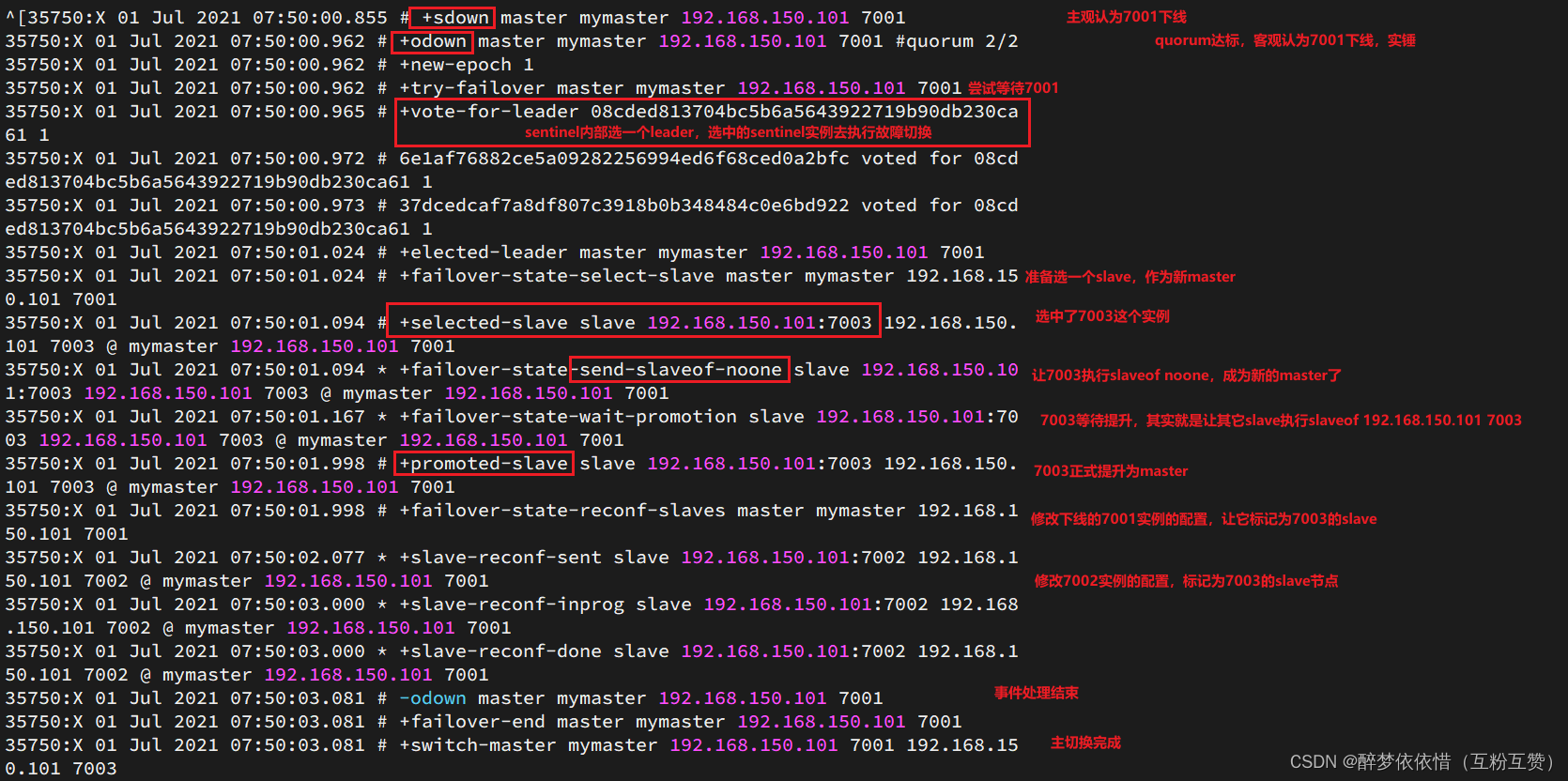 尝试让master节点7001宕机,查看sentinel日志: