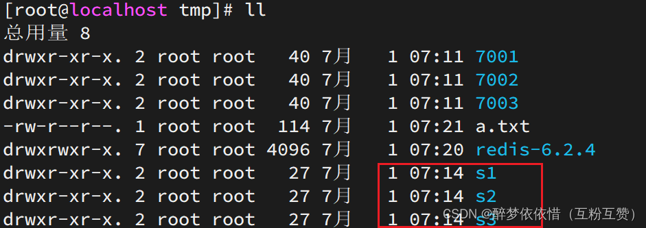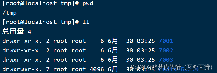 # 进入/tmp目录 cd /tmp # 创建目录 mkdir 7001 7002 7003如图: