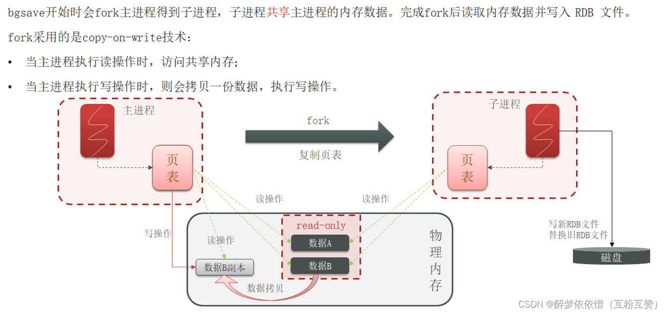 RDB全称Redis Database Backup file(Redis数据备份文件),也被叫做Redis数据快照。简单来说就是把内存中的所有数据都记录到磁盘中。当Redis实例故障重启后,从磁盘读取快照文件,恢复数据。