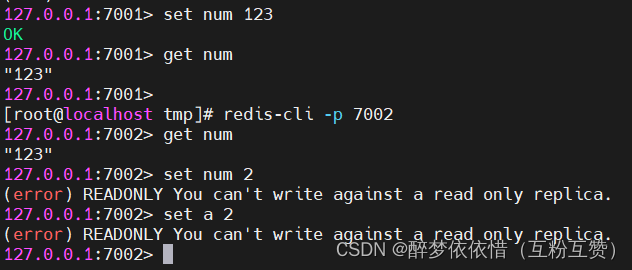 get num,再执行set num 888可以发现,只有在7001这个master节点上可以执行写操作,7002和7003这两个slave节点只能执行读操作。