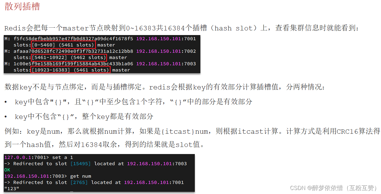 • 将 16384 个插槽分配到不同的实例• 根据 key 的有效部分计算哈希值,对 16384 取余• 余数作为插槽,寻找插槽所在实例即可如何将同一类数据固定的保存在同一个Redis实例?