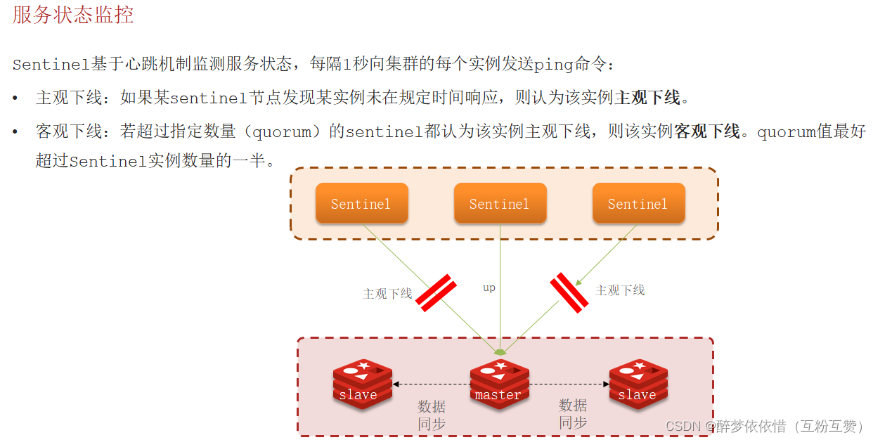 • 监控• 故障转移• 通知Sentinel如何判断一个redis实例是否健康?