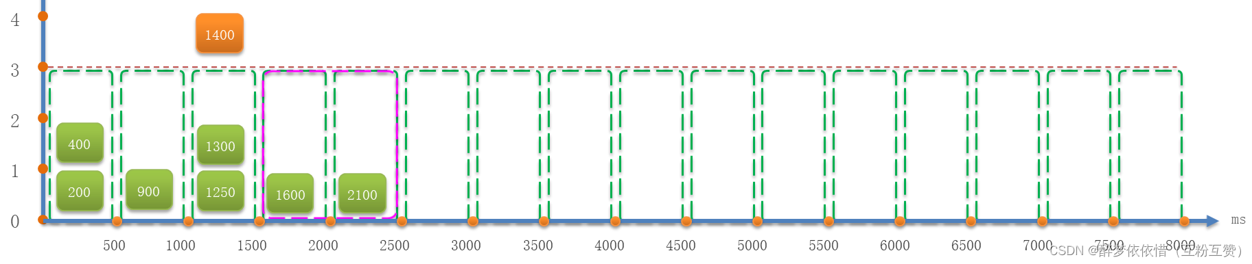 假如最新请求是2100ms请求,2100ms - 1000ms = 1100ms,即1100ms在第三个窗口,它的下一个窗口就是从1500ms算起,此时的请求数量是2个。