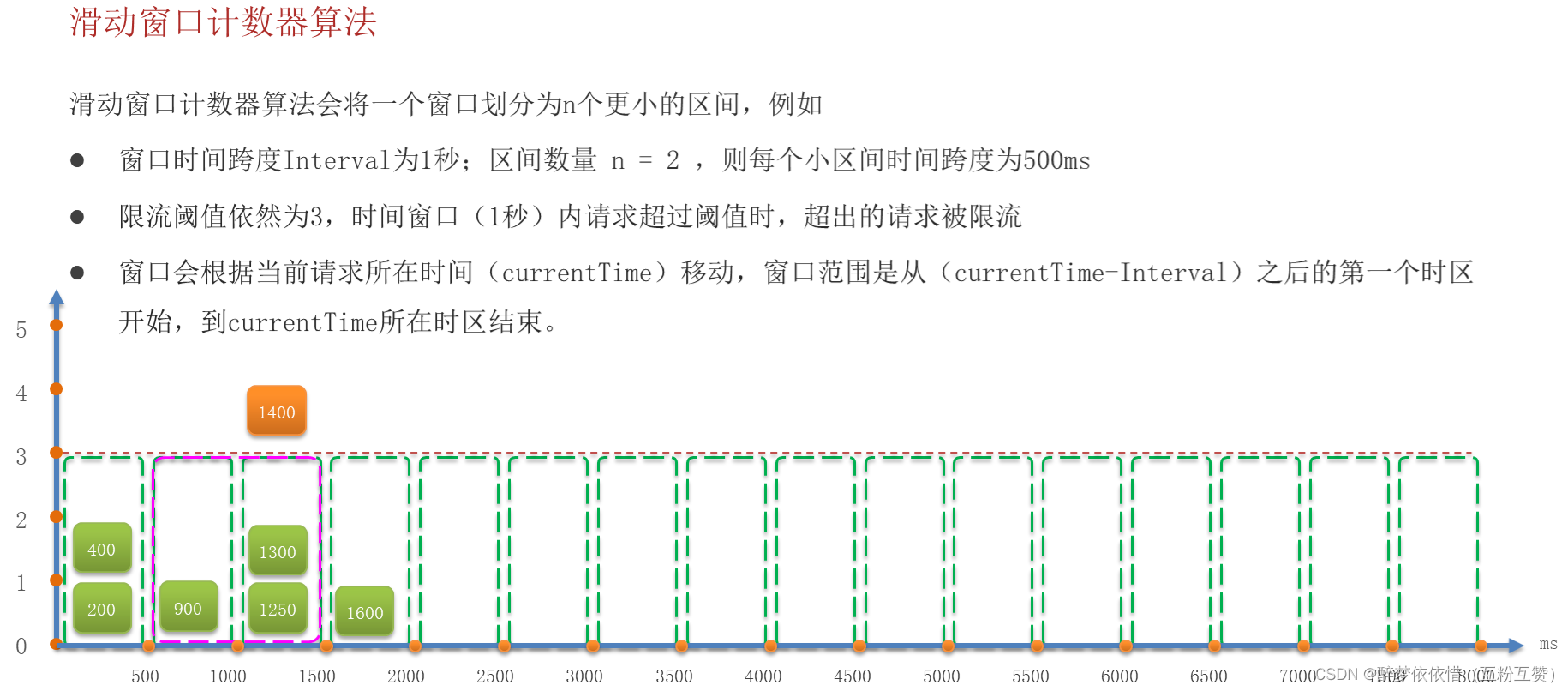 假如最新请求是1300ms请求,1300ms - 1000ms = 300ms,即300ms在第一个窗口,它的下一个窗口就是从500ms算起,此时的请求数量是3个。