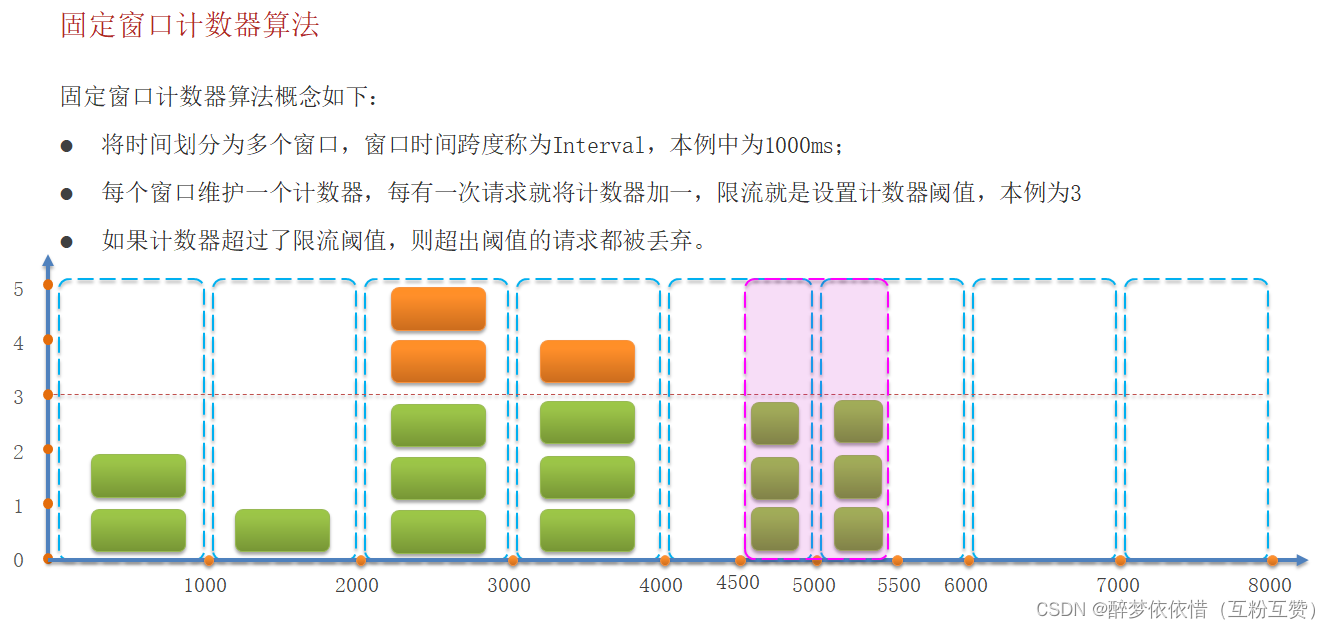 假如最新请求是1400ms请求,1400ms - 1000ms = 400ms,即400ms在第一个窗口,它的下一个窗口就是从500ms算起,此时的请求数量是4个,所以1400ms请求被拒绝。