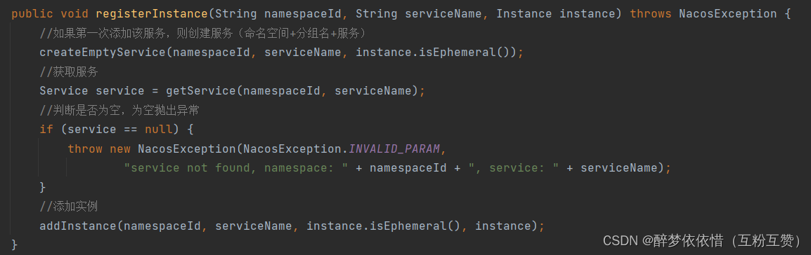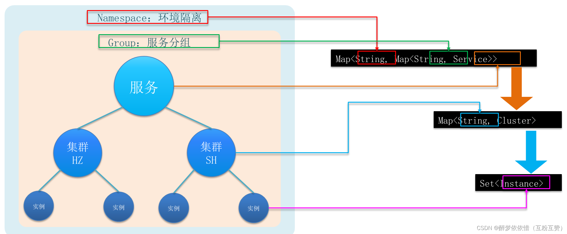 对应到Java代码中,Nacos采用了一个多层的Map来表示。结构为Map<String, Map<String, Service>>,其中最外层Map的key就是namespaceId,值是一个Map。内层Map的key是group拼接serviceName,值是Service对象。Service对象内部又是一个Map,key是集群名称,值是Cluster对象。而Cluster对象内部维护了Instance的集合。