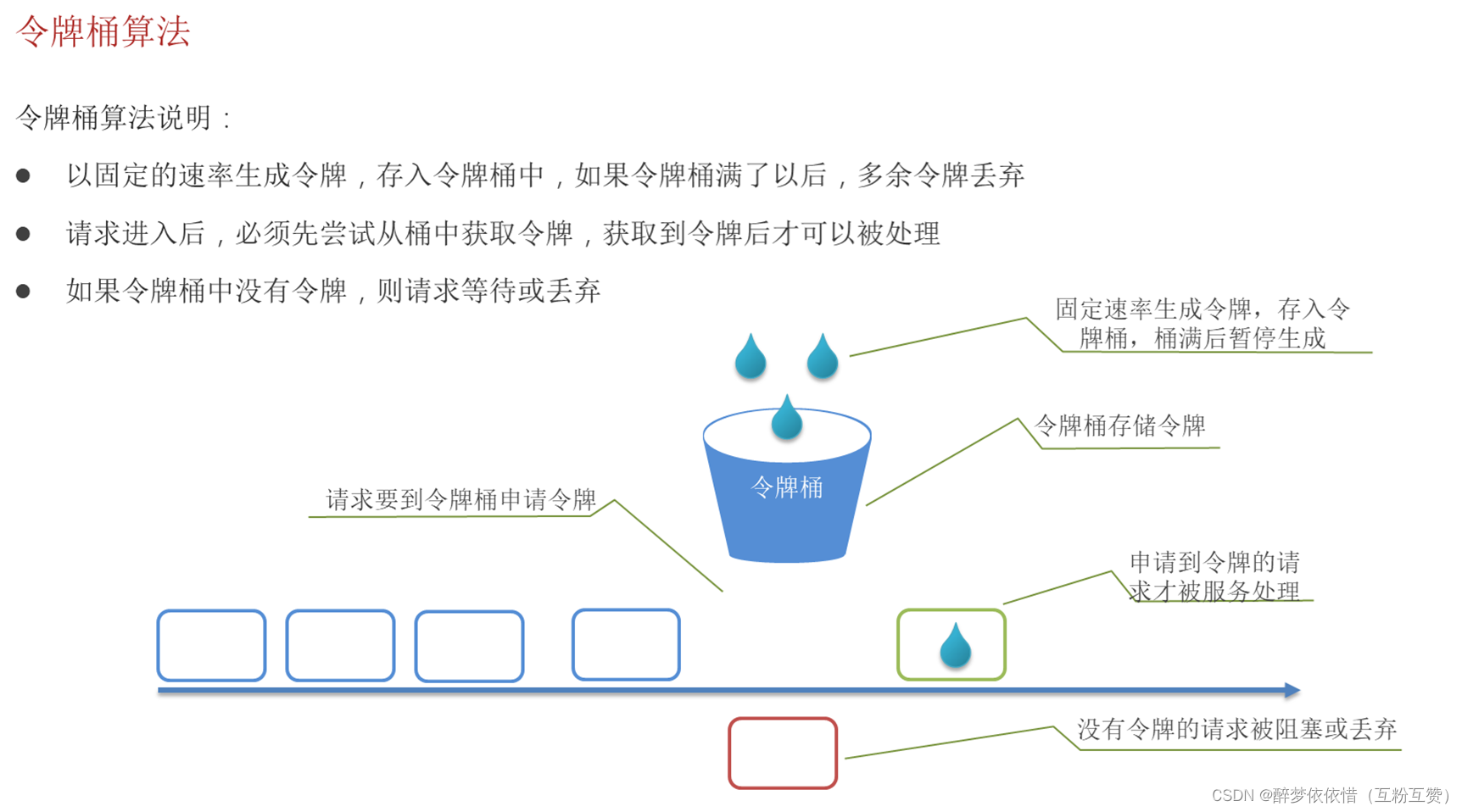 - 以固定速率往桶中添加令牌,直到桶满为止。这个速率可以通过计算得出,保证在单位时间内往桶中添加一定数量的令牌。