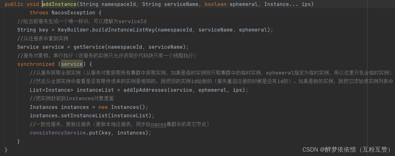 nacos的集群封装的实例是对象:Set<Instance>,比如修改了实例对象的数据的时候,还没改完,但是有客户端对其进行读,那么就会出现中间状态,出现脏读。